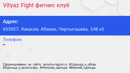 Vityaz Fight, фитнес-клуб по адресу 655017, Хакасия, Абакан, Чертыгашева, 148 к1 в дальнейшем Организация, размещена в следующих категориях:
