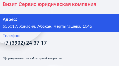 Визит-Сервис, юридическая компания по адресу 655017, Хакасия, Абакан, Чертыгашева, 104а в дальнейшем Организация, размещена в следующих категориях: