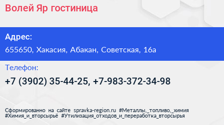 Волей Яр, гостиница по адресу 655650, Хакасия, Абакан, Советская, 16а в дальнейшем Организация, размещена в следующих категориях:
