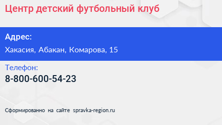 Центр, детский футбольный клуб по адресу Хакасия, Абакан, Комарова, 15 в дальнейшем Организация, размещена в следующих категориях: