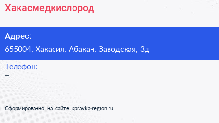 Хакасмедкислород по адресу 655004, Хакасия, Абакан, Заводская, 3д в дальнейшем Организация, размещена в следующих категориях: