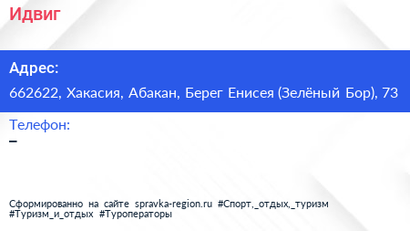 Идвиг по адресу 662622, Хакасия, Абакан, Берег Енисея (Зелёный Бор), 73 в дальнейшем Организация, размещена в следующих категориях: