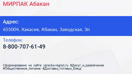 МИРПАК-Абакан по адресу 655004, Хакасия, Абакан, Заводская, 3п в дальнейшем Организация, размещена в следующих категориях: