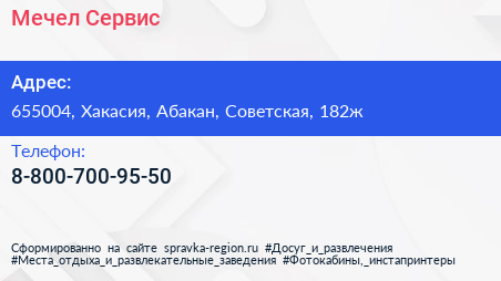 Мечел-Сервис по адресу 655004, Хакасия, Абакан, Советская, 182ж в дальнейшем Организация, размещена в следующих категориях: