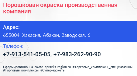 Порошковая окраска, производственная компания по адресу 655004, Хакасия, Абакан, Заводская, 6 в дальнейшем Организация, размещена в следующих категориях: