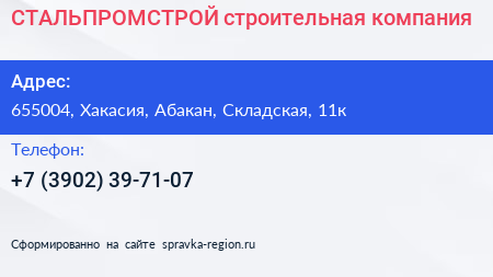 СТАЛЬПРОМСТРОЙ, строительная компания по адресу 655004, Хакасия, Абакан, Складская, 11к в дальнейшем Организация, размещена в следующих категориях: