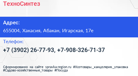 ТехноСинтез по адресу 655004, Хакасия, Абакан, Игарская, 17е в дальнейшем Организация, размещена в следующих категориях:
