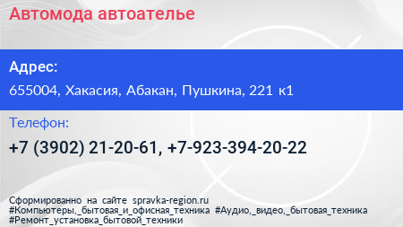 Автомода, автоателье по адресу 655004, Хакасия, Абакан, Пушкина, 221 к1 в дальнейшем Организация, размещена в следующих категориях: