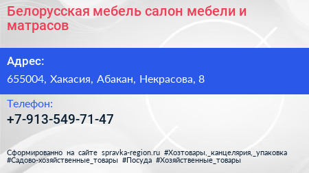 Белорусская мебель, салон мебели и матрасов по адресу 655004, Хакасия, Абакан, Некрасова, 8 в дальнейшем Организация, размещена в следующих категориях: