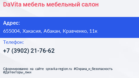 DaVita-мебель, мебельный салон по адресу 655004, Хакасия, Абакан, Кравченко, 11к в дальнейшем Организация, размещена в следующих категориях: