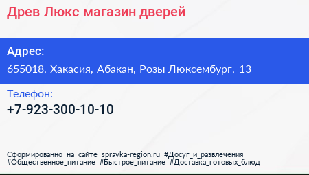 Древ-Люкс, магазин дверей по адресу 655018, Хакасия, Абакан, Розы Люксембург, 13 в дальнейшем Организация, размещена в следующих категориях: