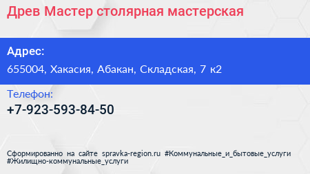 Древ Мастер, столярная мастерская по адресу 655004, Хакасия, Абакан, Складская, 7 к2 в дальнейшем Организация, размещена в следующих категориях: