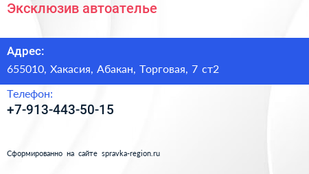 Эксклюзив, автоателье по адресу 655010, Хакасия, Абакан, Торговая, 7 ст2 в дальнейшем Организация, размещена в следующих категориях: