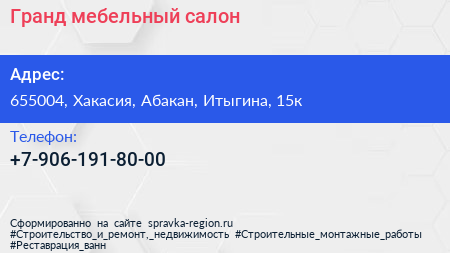 Гранд, мебельный салон по адресу 655004, Хакасия, Абакан, Итыгина, 15к в дальнейшем Организация, размещена в следующих категориях: