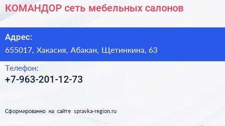 КОМАНДОР, сеть мебельных салонов по адресу 655017, Хакасия, Абакан, Щетинкина, 63 в дальнейшем Организация, размещена в следующих категориях: