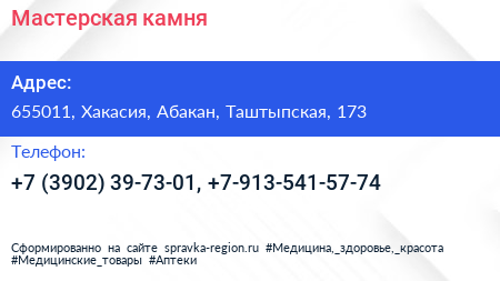 Мастерская камня по адресу 655011, Хакасия, Абакан, Таштыпская, 173 в дальнейшем Организация, размещена в следующих категориях: