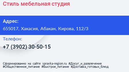 Стиль, мебельная студия по адресу 655017, Хакасия, Абакан, Кирова, 112/3 в дальнейшем Организация, размещена в следующих категориях: