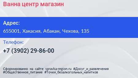 Ванна центр, магазин по адресу 655001, Хакасия, Абакан, Чехова, 135 в дальнейшем Организация, размещена в следующих категориях: