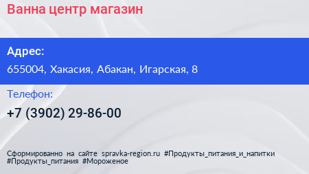 Ванна центр, магазин по адресу 655004, Хакасия, Абакан, Игарская, 8 в дальнейшем Организация, размещена в следующих категориях: