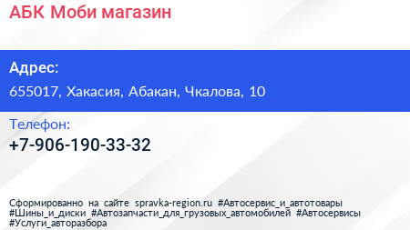 АБК Моби, магазин по адресу 655017, Хакасия, Абакан, Чкалова, 10 в дальнейшем Организация, размещена в следующих категориях: