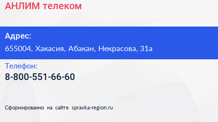 АНЛИМ телеком по адресу 655004, Хакасия, Абакан, Некрасова, 31а в дальнейшем Организация, размещена в следующих категориях: