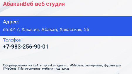 АбаканВеб, веб-студия по адресу 655017, Хакасия, Абакан, Хакасская, 56 в дальнейшем Организация, размещена в следующих категориях: