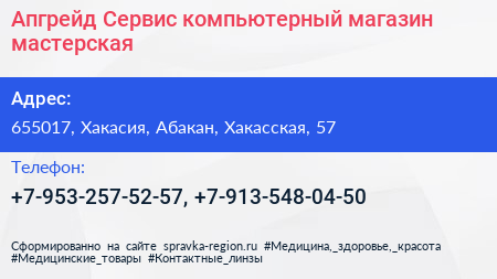 Апгрейд-Сервис, компьютерный магазин-мастерская по адресу 655017, Хакасия, Абакан, Хакасская, 57 в дальнейшем Организация, размещена в следующих категориях: