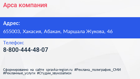 Арса, компания по адресу 655003, Хакасия, Абакан, Маршала Жукова, 46 в дальнейшем Организация, размещена в следующих категориях: