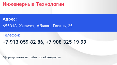 Инженерные Технологии по адресу 655018, Хакасия, Абакан, Гавань, 25 в дальнейшем Организация, размещена в следующих категориях: