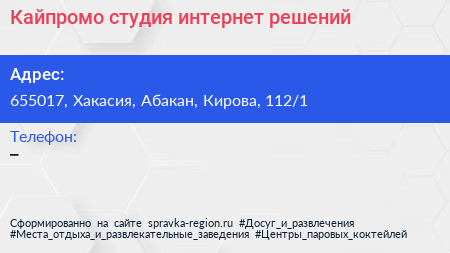 Кайпромо, студия интернет-решений по адресу 655017, Хакасия, Абакан, Кирова, 112/1 в дальнейшем Организация, размещена в следующих категориях: