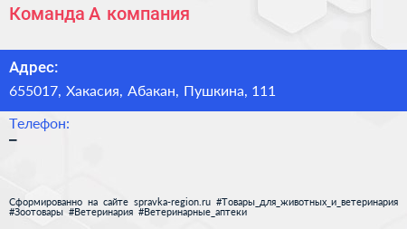 Команда А, компания по адресу 655017, Хакасия, Абакан, Пушкина, 111 в дальнейшем Организация, размещена в следующих категориях: