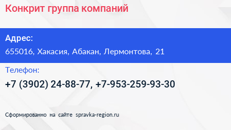 Конкрит, группа компаний по адресу 655016, Хакасия, Абакан, Лермонтова, 21 в дальнейшем Организация, размещена в следующих категориях: