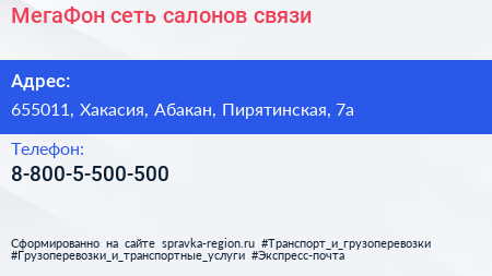 МегаФон, сеть салонов связи по адресу 655011, Хакасия, Абакан, Пирятинская, 7а в дальнейшем Организация, размещена в следующих категориях: