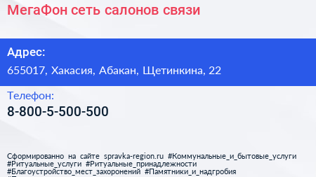 МегаФон, сеть салонов связи по адресу 655017, Хакасия, Абакан, Щетинкина, 22 в дальнейшем Организация, размещена в следующих категориях: