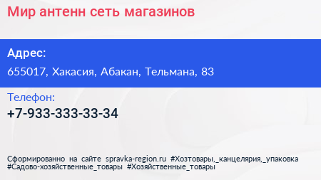 Мир антенн, сеть магазинов по адресу 655017, Хакасия, Абакан, Тельмана, 83 в дальнейшем Организация, размещена в следующих категориях: