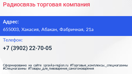 Радиосвязь, торговая компания по адресу 655003, Хакасия, Абакан, Фабричная, 21а в дальнейшем Организация, размещена в следующих категориях: