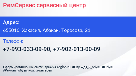 РемСервис, сервисный центр по адресу 655016, Хакасия, Абакан, Торосова, 21 в дальнейшем Организация, размещена в следующих категориях: