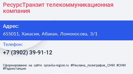 РесурсТранзит, телекоммуникационная компания по адресу 655011, Хакасия, Абакан, Ломоносова, 3/1 в дальнейшем Организация, размещена в следующих категориях: