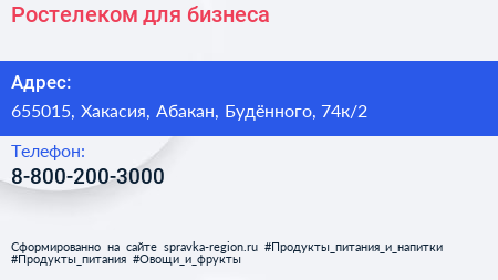 Ростелеком для бизнеса по адресу 655015, Хакасия, Абакан, Будённого, 74к/2 в дальнейшем Организация, размещена в следующих категориях: