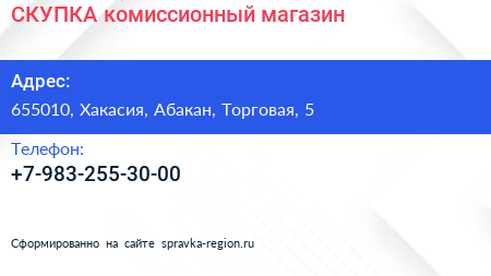 СКУПКА, комиссионный магазин по адресу 655010, Хакасия, Абакан, Торговая, 5 в дальнейшем Организация, размещена в следующих категориях: