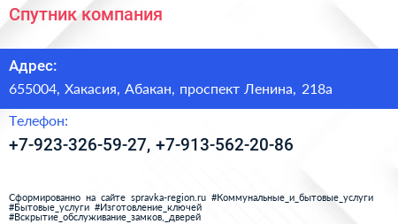 Спутник, компания по адресу 655004, Хакасия, Абакан, проспект Ленина, 218а в дальнейшем Организация, размещена в следующих категориях: