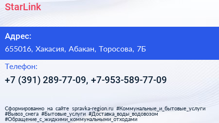 StarLink по адресу 655016, Хакасия, Абакан, Торосова, 7Б в дальнейшем Организация, размещена в следующих категориях: