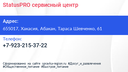 StatusPRO, сервисный центр по адресу 655017, Хакасия, Абакан, Тараса Шевченко, 61 в дальнейшем Организация, размещена в следующих категориях: