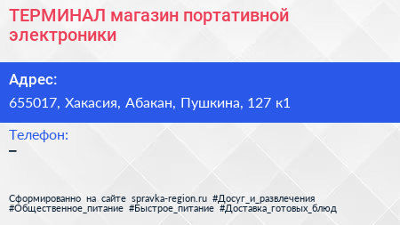 ТЕРМИНАЛ, магазин портативной электроники по адресу 655017, Хакасия, Абакан, Пушкина, 127 к1 в дальнейшем Организация, размещена в следующих категориях: