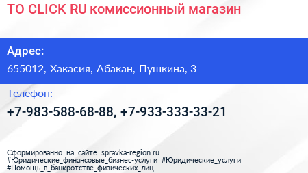 TO-CLICK.RU, комиссионный магазин по адресу 655012, Хакасия, Абакан, Пушкина, 3 в дальнейшем Организация, размещена в следующих категориях: