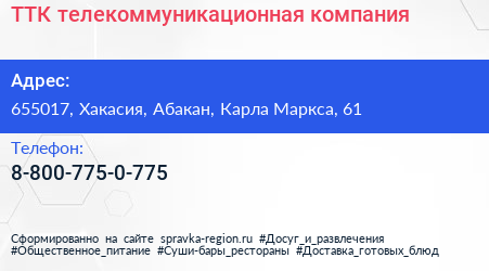 ТТК, телекоммуникационная компания по адресу 655017, Хакасия, Абакан, Карла Маркса, 61 в дальнейшем Организация, размещена в следующих категориях: