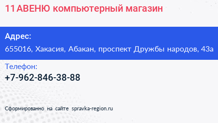 11 АВЕНЮ, компьютерный магазин по адресу 655016, Хакасия, Абакан, проспект Дружбы народов, 43а в дальнейшем Организация, размещена в следующих категориях: