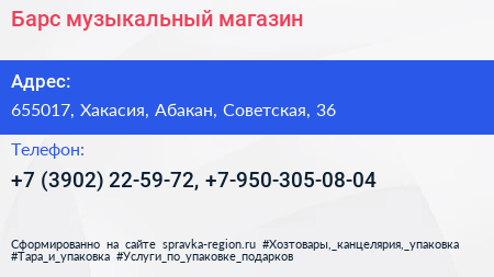 Барс, музыкальный магазин по адресу 655017, Хакасия, Абакан, Советская, 36 в дальнейшем Организация, размещена в следующих категориях: