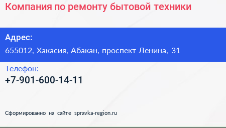 Компания по ремонту бытовой техники по адресу 655012, Хакасия, Абакан, проспект Ленина, 31 в дальнейшем Организация, размещена в следующих категориях: