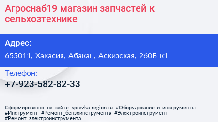 Агроснаб19, магазин запчастей к сельхозтехнике по адресу 655011, Хакасия, Абакан, Аскизская, 260Б к1 в дальнейшем Организация, размещена в следующих категориях: